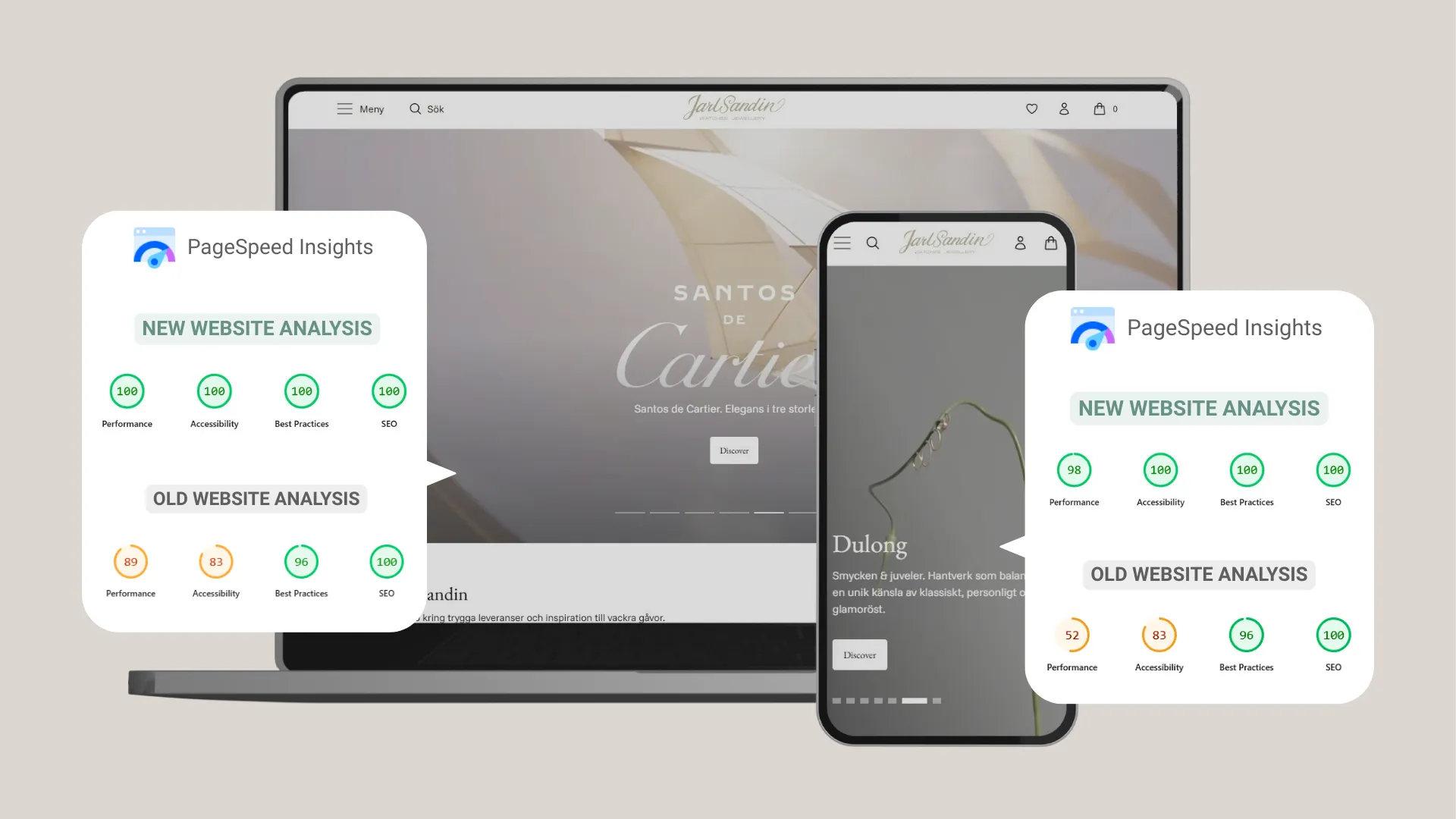 Skillnaden i prestanda mellan den gamla och den nya webbshoppen för Jarl Sandin är betydande både när det gäller laddningstider och användarupplevelse. Den gamla webbplatsen hade genomsnittlig laddningstid på flera sekunder, vilket ledde till märkbar fördröjning, särskilt på mobila enheter.